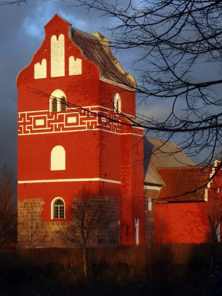 Herover: Ålum Kirke i aftensol som vi ser den fra vinduet mod syd.